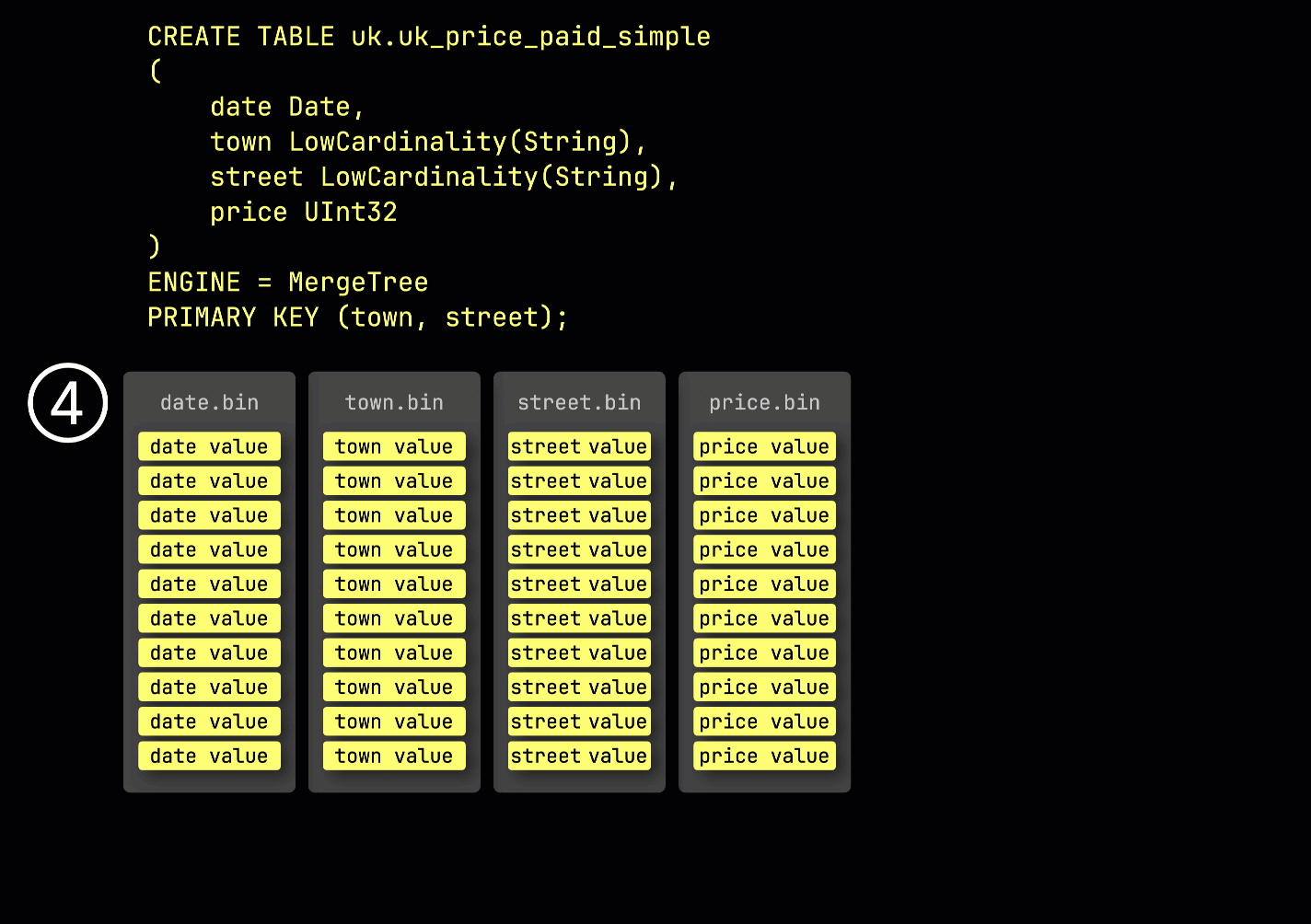 As a reminder, in our ① example table with the primary key (town, street), ② inserted data is ③ stored on disk, sorted by the primary key column values, and compressed, in separate files for each column:
